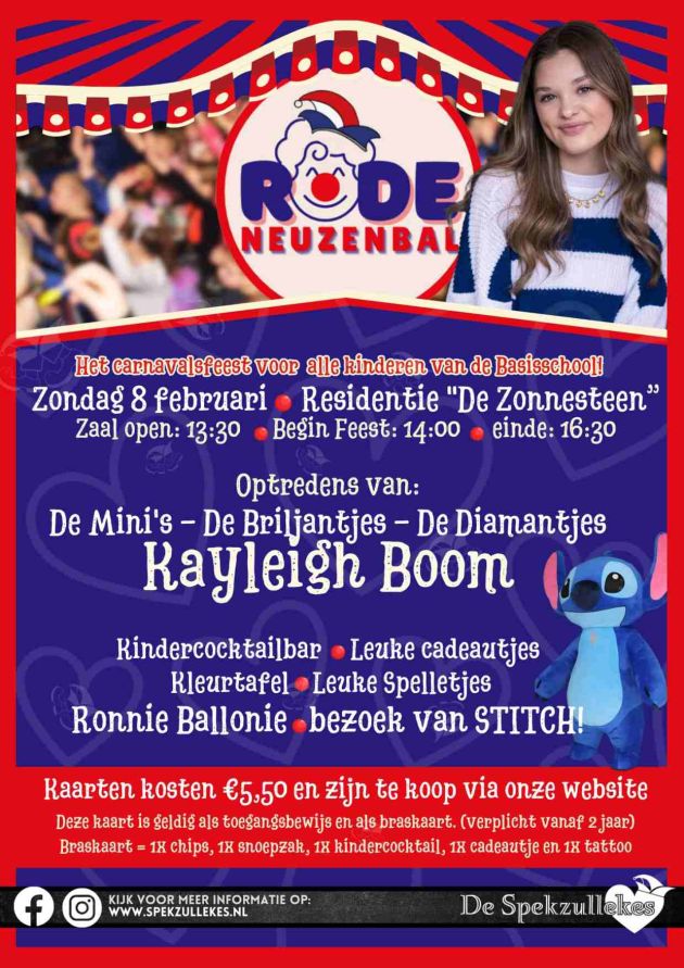 Dat betekent een middag vol verrassingen én onbeperkt ranja voor de kids! (Let op: vanaf 2 jaar verplicht, ouders mogen gratis mee feesten!) Tijdens deze middag kunnen we genieten van de optredens van onze dansgarde, Ronnie Ballonie en een bezoek van STITCH! Ook zijn er leuke activiteiten voor de kinderen.