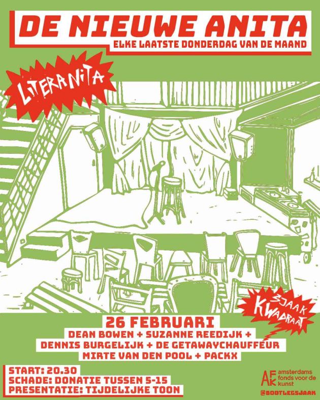 Sjaak Kwadraat brengt met Literanita elke laatste donderdag van de maand weer een nieuwe lading geprogrammeerde muziek, poëzie, spoken word, theater en performance naar de kelder van de nieuwe Anita.