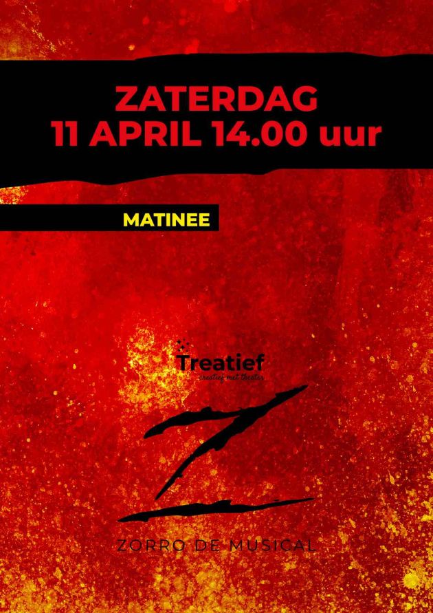 Informatie: Treatief brengt Zorro de Musical! Een spannende, meeslepende en swingende musical over Diego, een knappe, charmante jongeman met een onstuimig en rebels karakter. Samen met de prachtige zigeunerin Inez reist hij door het land, waar hij bekend wordt als “El Californiano”. Zijn spectaculaire stunts als illusionist maken hem al snel een legende.