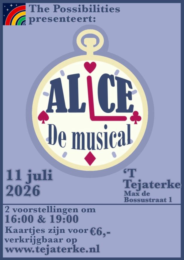 Informatie: "Wie ben jij als alles om je heen zo anders is? Ontdek het in de nieuwste productie van The Possibilities: Alice de musical. Een zelfgeschreven musical gebaseerd op het verhaal van Alice in wonderland."