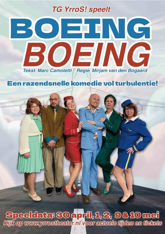 Theatergroep YrroS! brengt de klassieke komedie Boeing Boeing: een sprankelend stuk waarin liefde, leugens en landingsschema’s gevaarlijk door elkaar lopen.